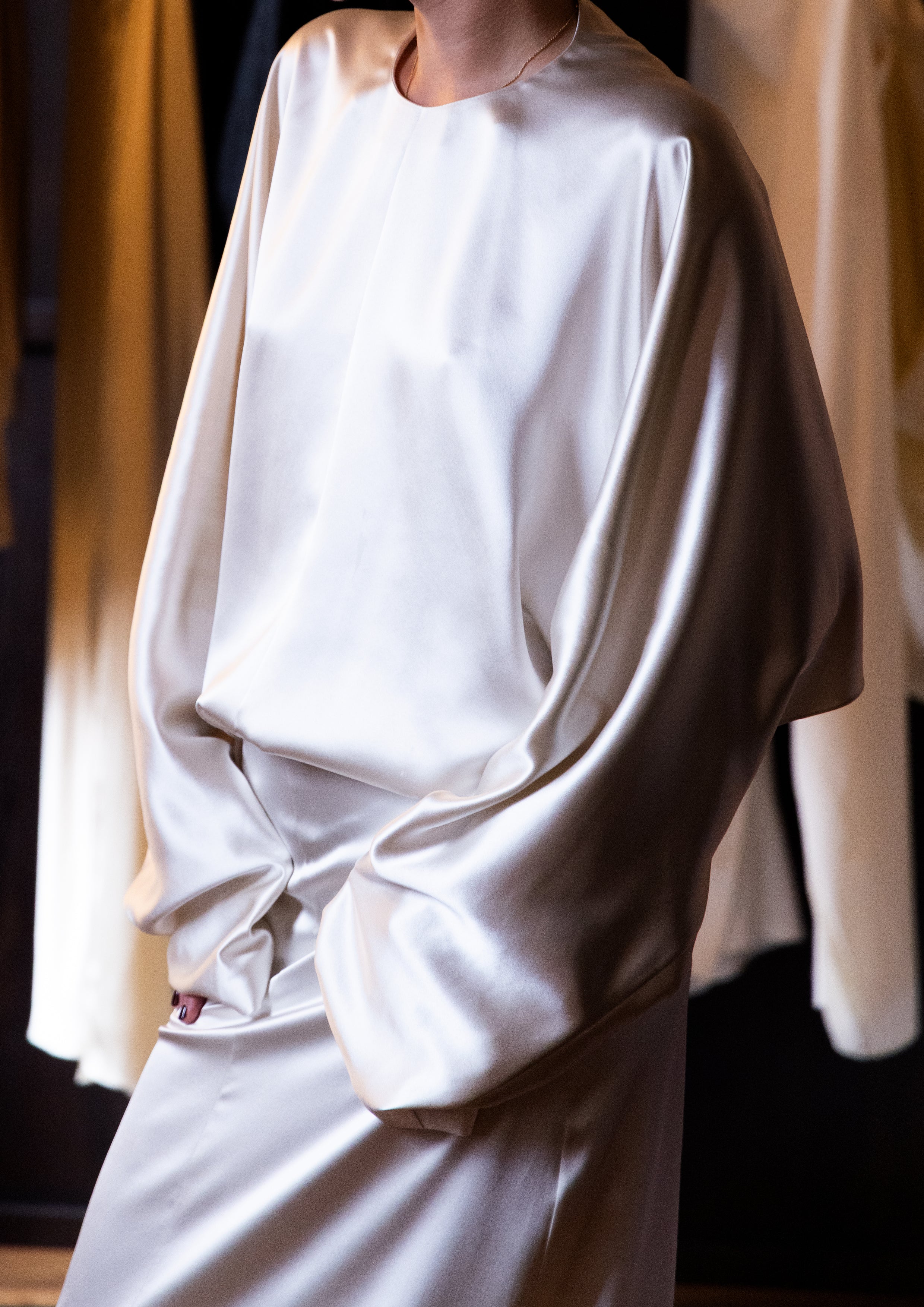 Wardrobe 26 celebrates the private rituals of women through the evening wardrobe. Those moments that are often left unseen, yet remain deeply meaningful. Each piece, individually (and then, collectively), tells a story wrapped and draped in a natural charm, one soft and delicate to the touch yet undoubtedly invaluable. There is a continued emphasis on fit, silhouette, and longevity, yet with some room for experimentation - necklines that drape like an oil-painted waterfall, smooth trouser pants that bellow at the inseam yet kindly nurture curves, and sleeves that cascade weightlessly like a candle flame. Through fabric, cut, and subtle detailing, the garments foster a deeper emotional connection, resisting the fleeting cycle of disposability and instead building a wardrobe of permanence. Thus, Mira’s designs effortlessly redefine women’s modernity while embodying a woman’s (potential) sensuality–what you see isn’t entirely what you get, but you fall in love with what’s on the surface just as easily.