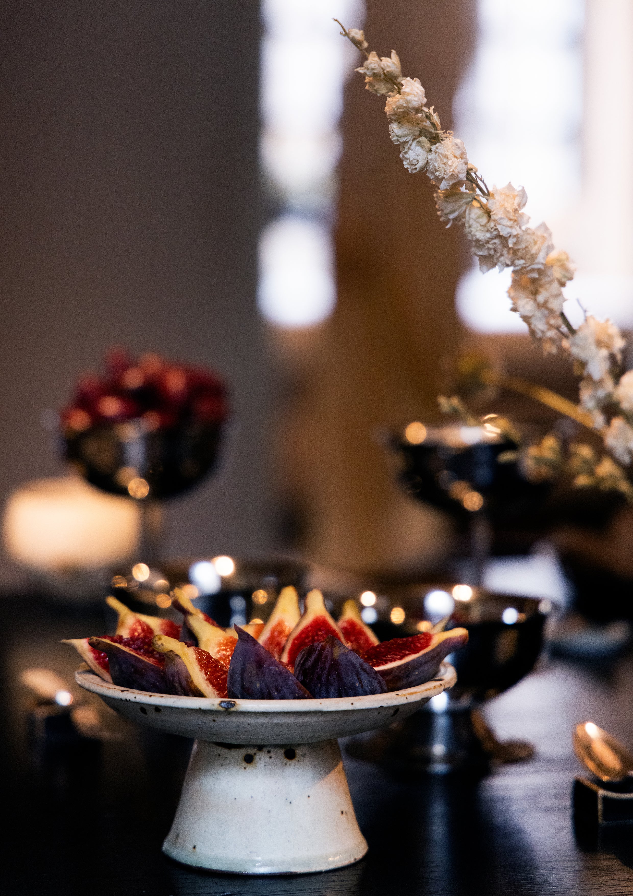 Curated by Zina Jamil of Studio Deïmé, who oversaw the food selection and ambience, the trunk show was conceived as an immersive introduction to the world of Mira Maktabi; one of opulence, reverie, and resilience. It was an invitation into an atmosphere where design, culture, and intimacy seamlessly intertwined, where meticulous tailoring met with aromatic scents and flavours rooted in her Middle Eastern, Lebanese heritage. This involved a handpicked menu that reflected the spirit of the collection: thoughtful, elegant, and rooted in culture. Guests were welcomed with brunch and cocktails inspired by Middle Eastern flavours; traditional mini Lebanese ka’ak by Common Breads, fresh figs, grapes and cheeses, alongside tarts infused with orange blossom water and white chocolate. These gestures honoured Mira’s heritage while creating a sensory backdrop for the collection’s unveiling.