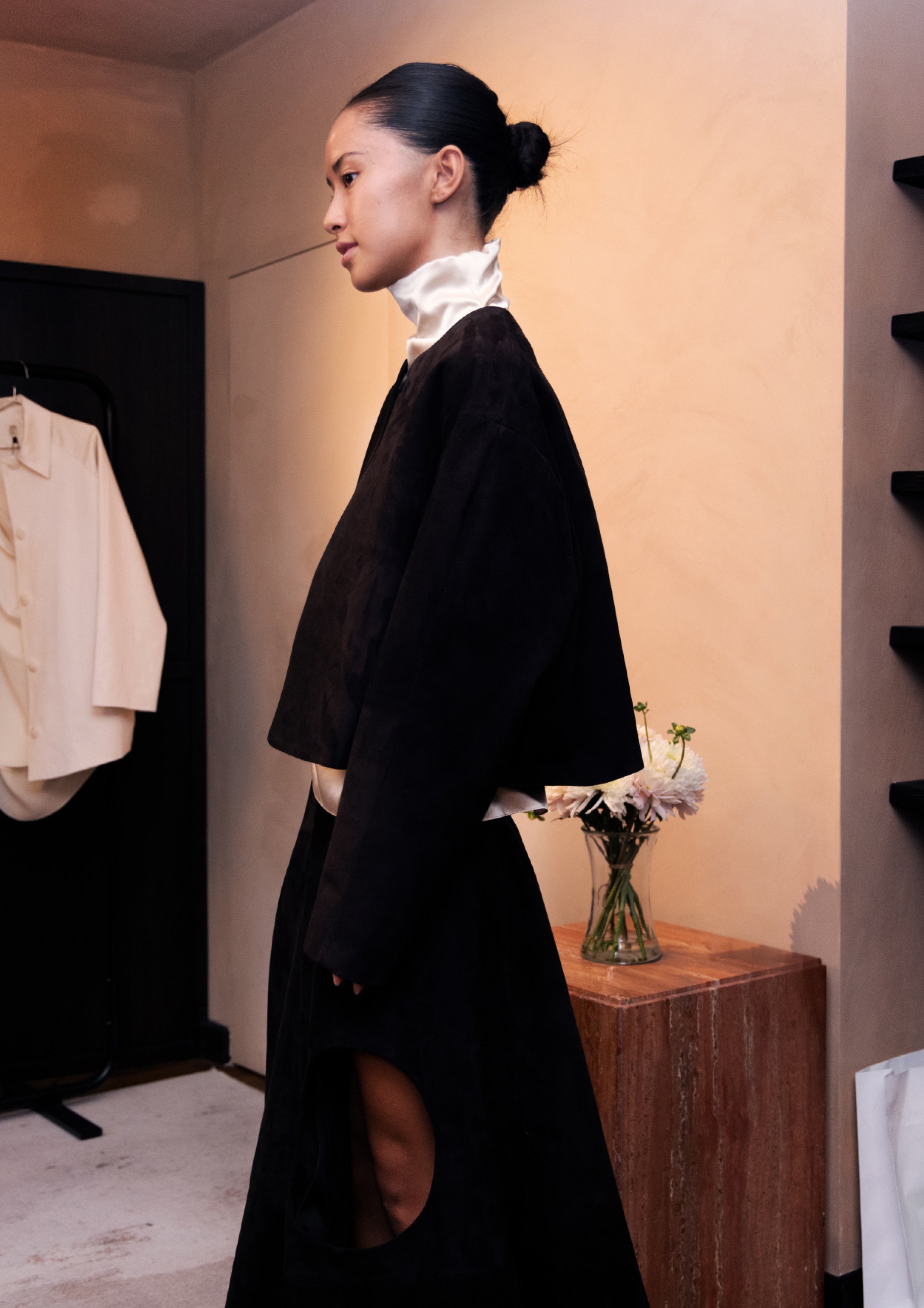 Crafted in London from Savile Row wool and fine silks, each garment honours natural fibres and rejects synthetics–an ethos the Lebanese designer refuses to fall short of. Hidden details, such as silk satin linings in collars, silk chiffon panels on trouser legs and silk habotai lining in all of the outerwear, whisper directly to Maktabi’s philosophy of clothes as personal companions; that these garments, which can (and should) double as heirlooms, are to be worn and cherished.